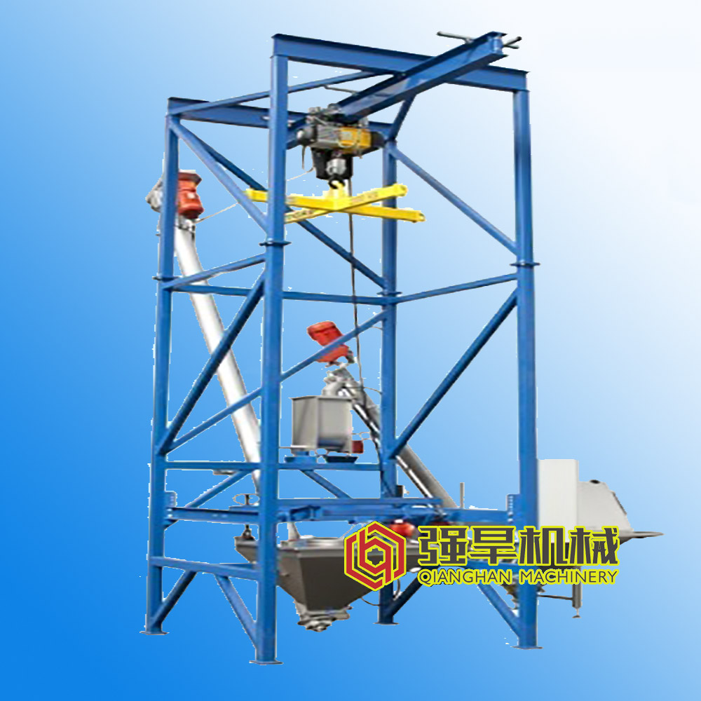 1、設備支架; 2、電動葫蘆;(也可用客戶自有的行車、叉車等起重設備) 3、噸袋吊架(十字吊架); 4、夾袋裝置(夾袋器); 5、破碎、拍打、振動、磁選裝置(可選); 6、過渡緩沖料倉; 7、接口結構:進料口可接光圈閥、收口裝置;出料口可接旋轉卸料閥、碟閥、插板閥、真空上料機、螺旋輸送機、管鏈輸送機,配比計量設備,料斗,料倉,氣力輸送系統(tǒng)等。