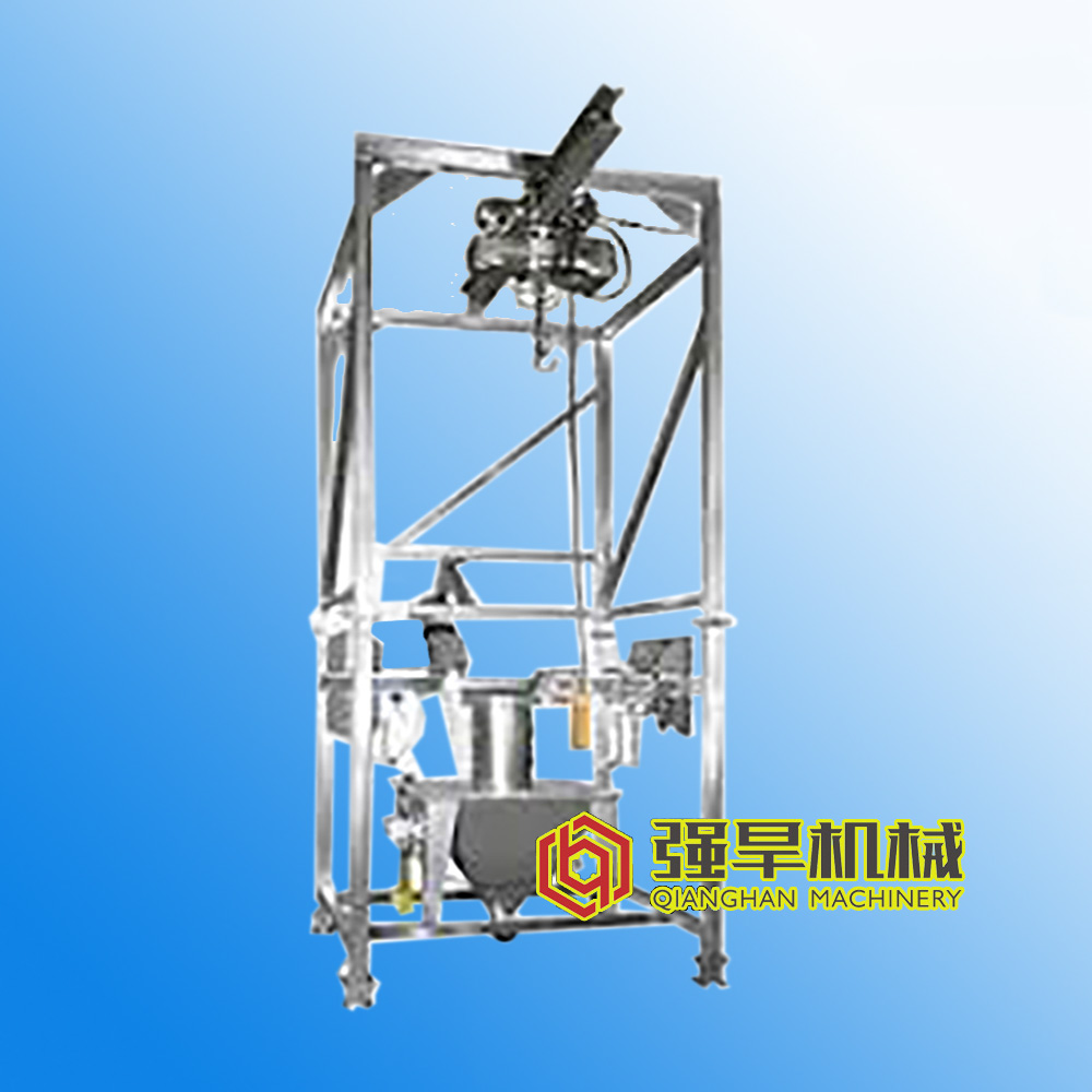 1.通過叉車或打開安裝在噸袋拆包機設(shè)備支架上的電動葫蘆開關(guān),操縱叉車或者將噸袋固定在噸袋吊架上提升至進料口